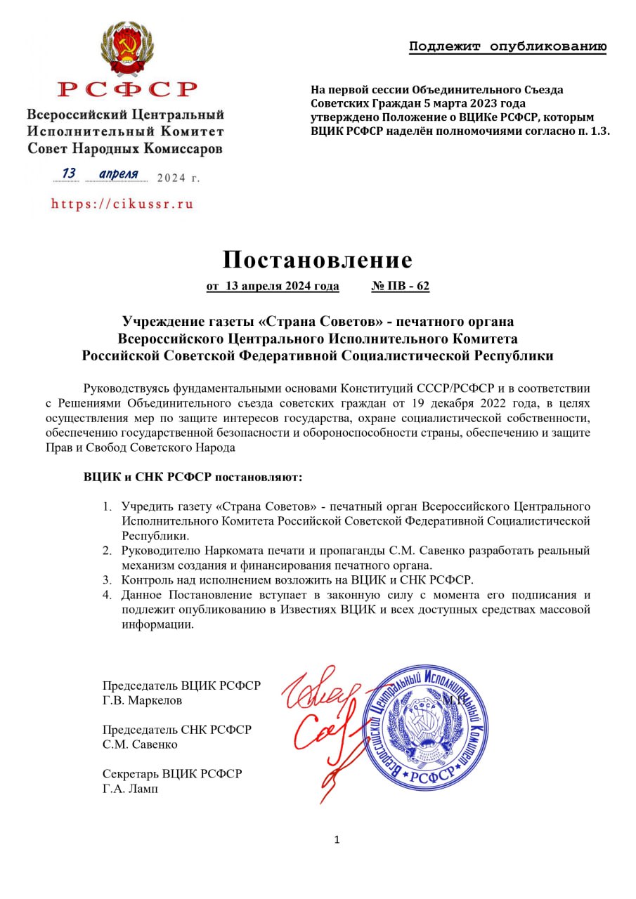 Публикации Постановлений ВЦИК-СНК РСФСР